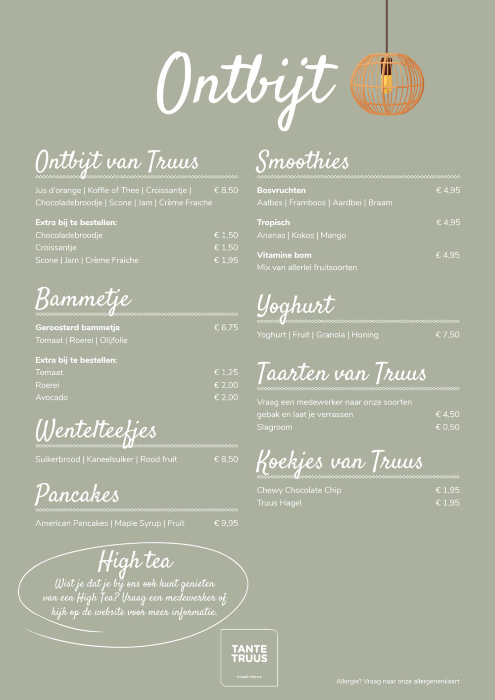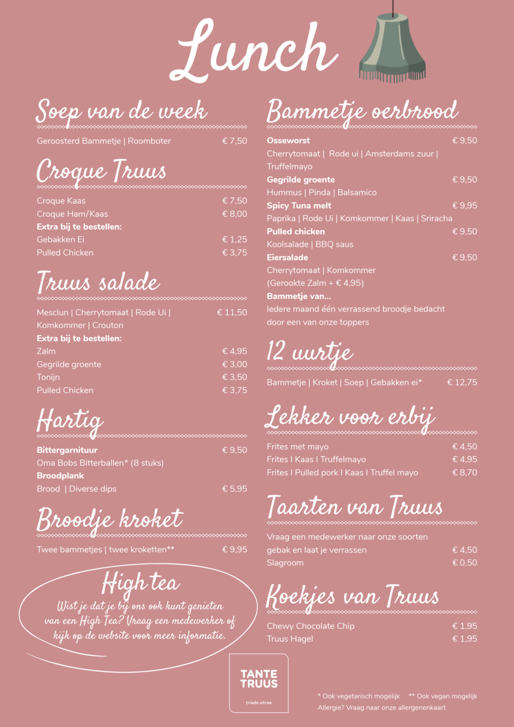 Wist je dat je bij ons ook terecht kunt voor een overheerlijke High Tea? Dit is te bestellen vanaf twee personen en perfect voor als je iets bijzonders te vieren hebt. Alle producten in de High Tea zijn met zorg geselecteerd en altijd vers bereid met aandacht voor duurzaamheid. Dit culinair feestje begint al bij het uitzoeken van de thee. De gerechten bestaan uit verschillende zoete hapjes en hartige koud en warme gerechten afhankelijk van de variant die je kiest – écht een aanrader! Als je het tijdig aan ons doorgeeft, houden wij graag rekening met eventuele dieetwensen en/of allergenen. Bekijk hier alvast de allergenen kaart . Reserveren kan hieronder.
